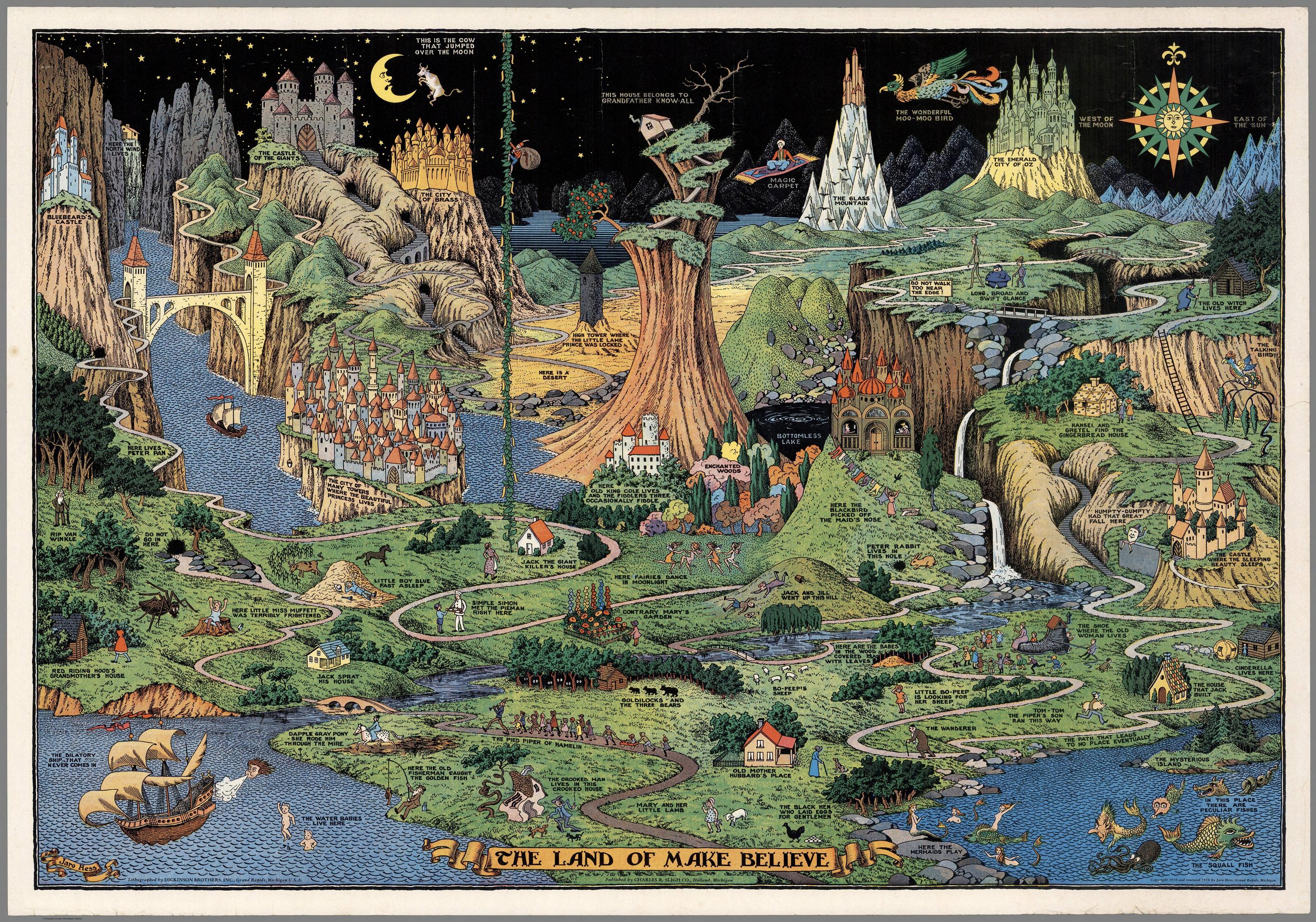 My mom grew up with this “The Land of Make Believe” poster and passed it along to me when I was a toddler. She hung it in my bedroom. I spent my childhood following the fantastic paths, flying on the magic carpet, and wanting to visit the Glass Mountain.